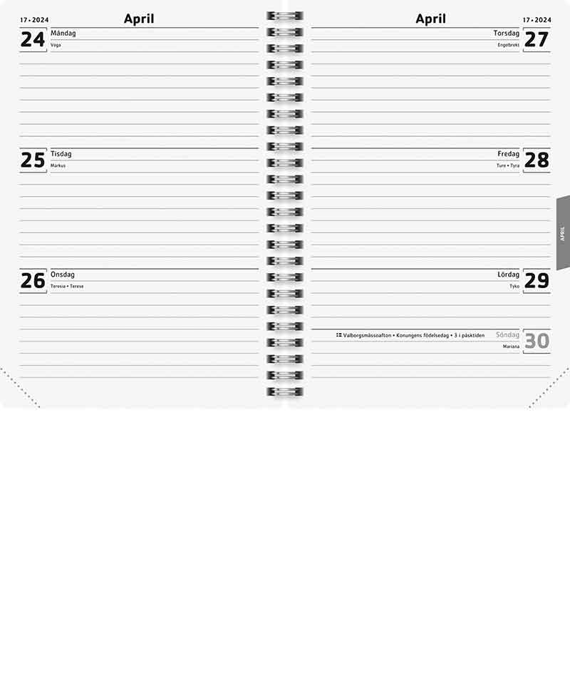 Layout: 1 vecka per uppslag. Classic radvis kalenderlayout