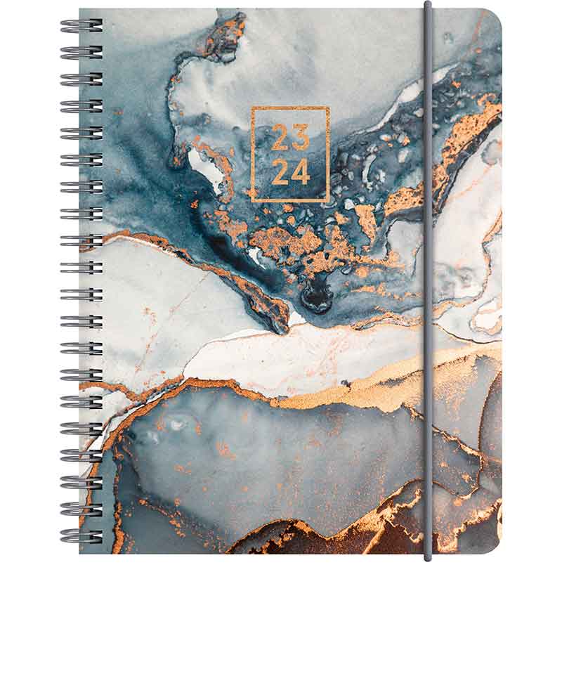 Elevkalender 2023/24 i A6 format med spiralbindning och gummiband.