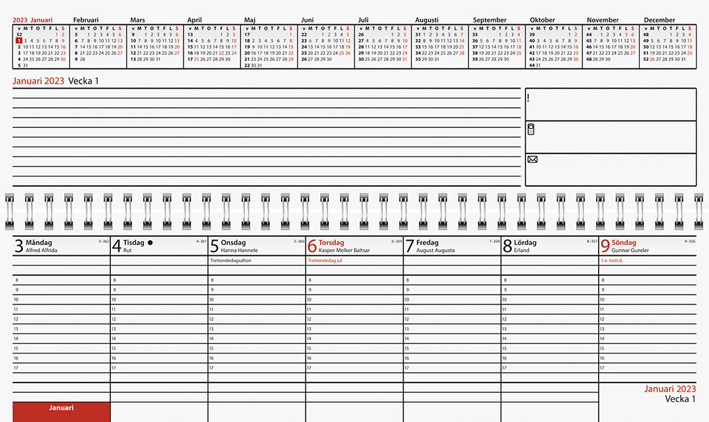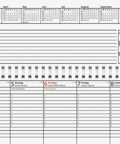 - Allmänna hegdagar och 6 månaders månadsöversikt på varje uppslag